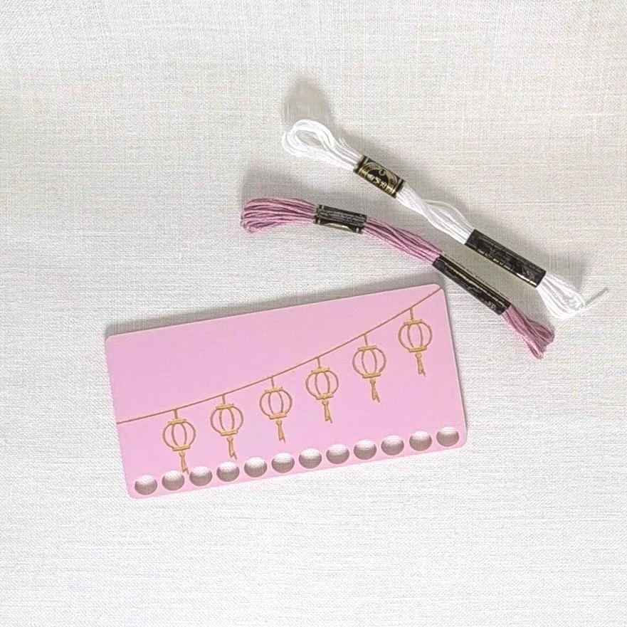 Matte pastel pink acrylic thread organizer with hanging lanterns engraved in a swag across the front.